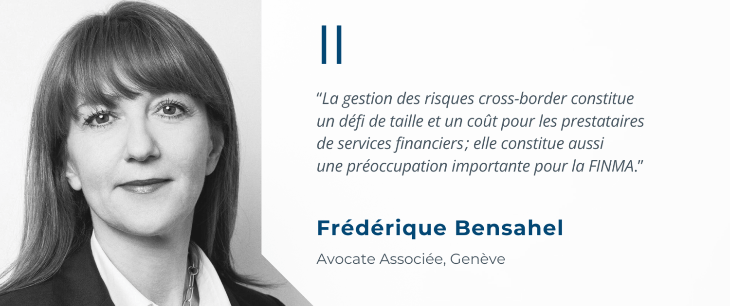 La gestion des risques cross-border constitue un défi de taille et un coût pour les prestataires de services financiers ; elle constitue aussi une préoccupation importante pour la FINMA. La fourniture de services financiers est en principe règlementée par chaque État et la réglementation étrangère est loin d’être uniforme, ce qui rend généralement l’accès à un marché étranger – lorsqu’il est possible – onéreux et très complexe au niveau opérationnel. Le « Berne Financial Services Agreement » permettra aux prestataires suisses de faire la promotion et de rendre des services financiers non seulement sans obligation d’autorisation mais encore dans l’application de leurs propres règles prudentielles. La gestion des risques des prestataires s’en trouvera ainsi largement facilitée. L’adoption de l’accord laisse présager de réjouissantes perspectives de développement pour l’industrie financière suisse sur l’une des principales places financières mondiales.
