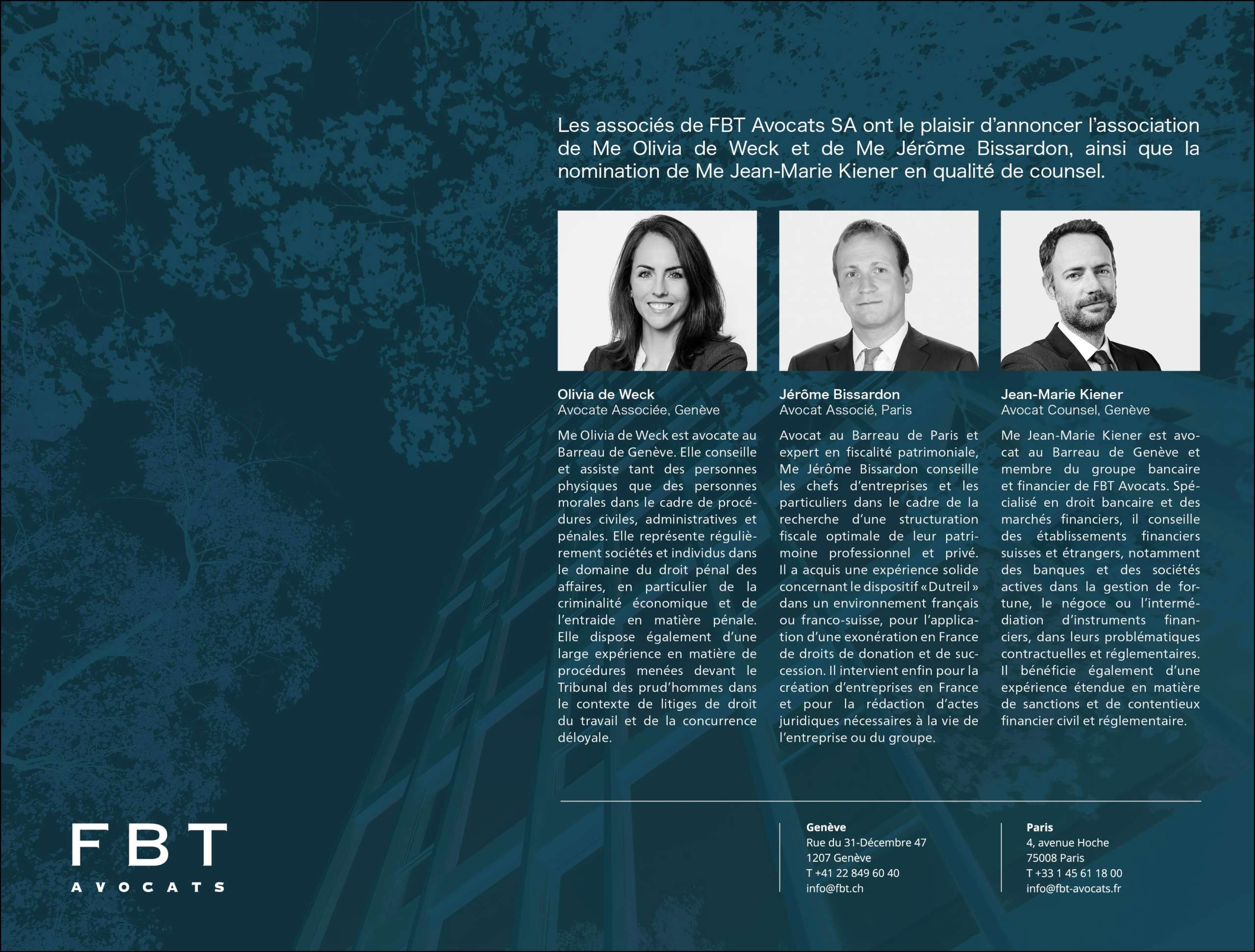 Les associés de FBT Avocats SA ont le plaisir d’annoncer l’association de Me Olivia de Weck et de Me Jérôme Bissardon, ainsi que la nomination de Me Jean-Marie Kiener en qualité de counsel.