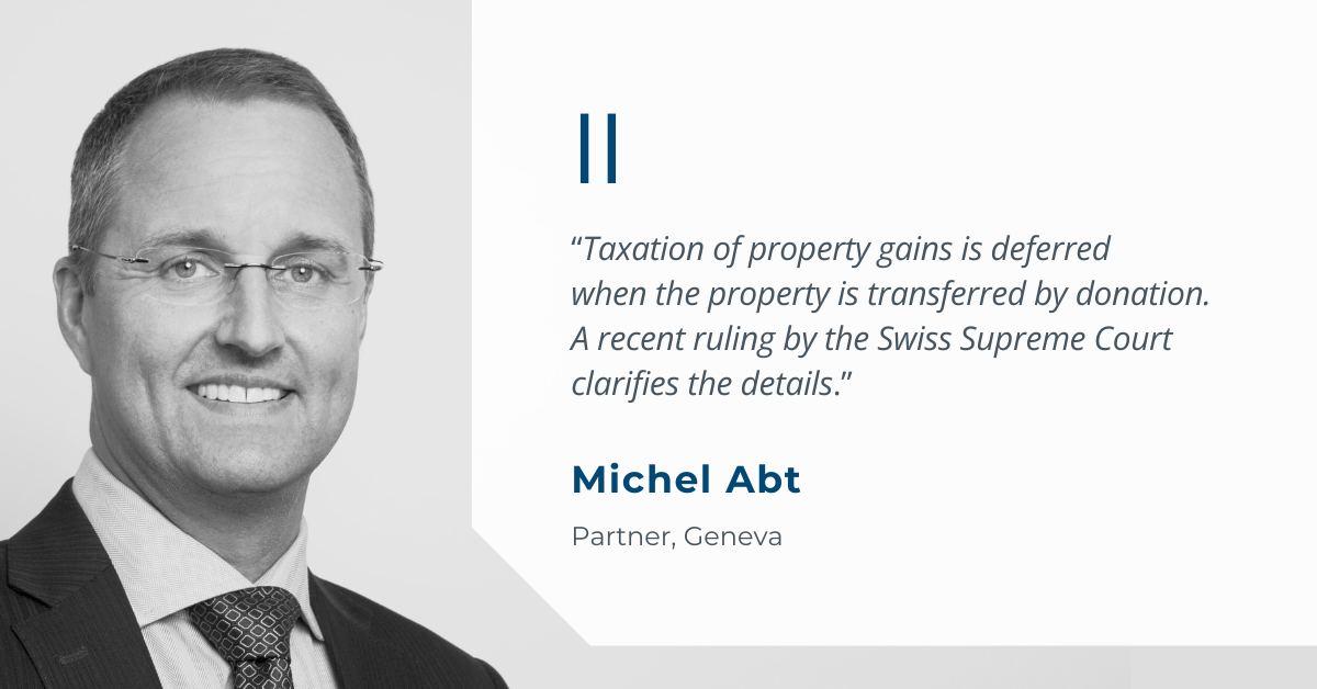 Selon la jurisprudence du Tribunal fédéral, la notion de donation est harmonisée et le report de l’imposition à ce titre doit être admis non seulement en cas de donation pure, mais également en cas de donation mixte. En général, une donation mixte est admise lorsque la contreprestation est 25% inférieure à la valeur vénale du bien immobilier. Dans un tel cas, a fortiori entre proches, on considèrera que le vendeur avait l’intention de donner partiellement le bien.