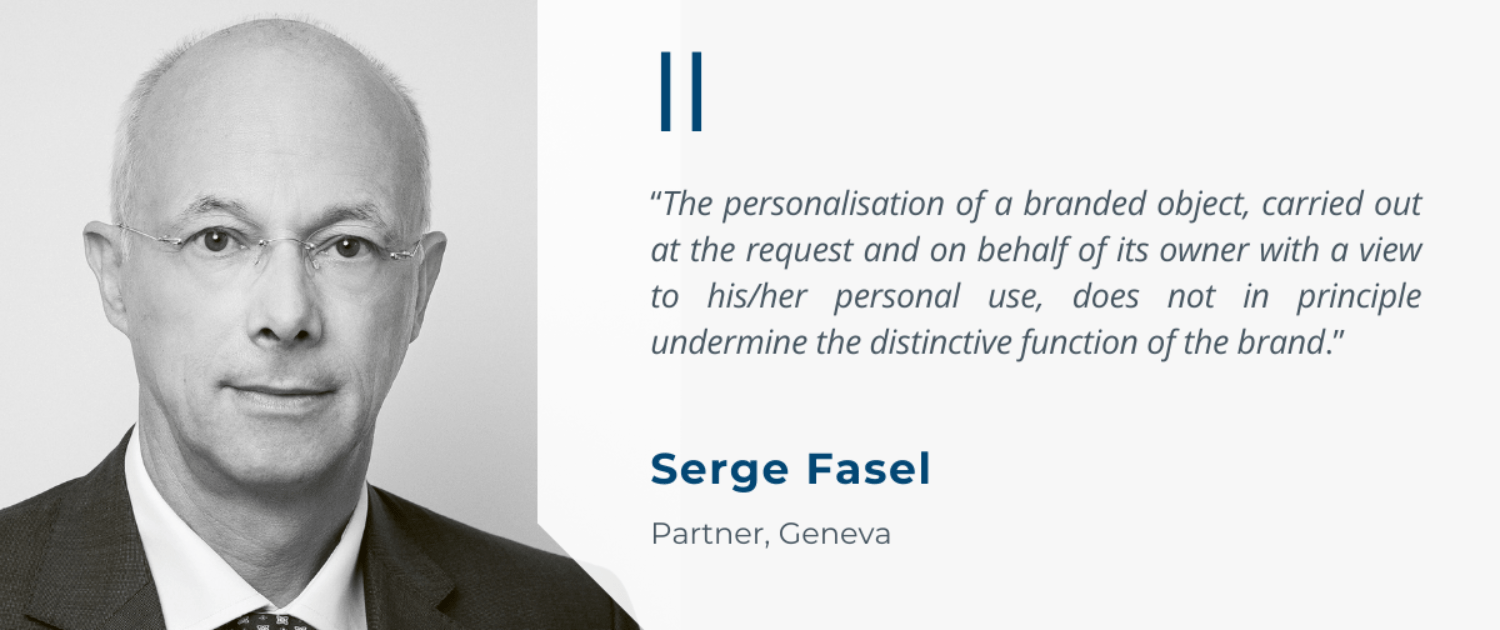 La personnalisation d’un objet de marque, effectuée à la demande et pour le compte de son propriétaire en vue de son usage personnel, ne porte en principe pas atteinte à la fonction distinctive de la marque, car l’objet modifié est destiné à un usage privé et n’est pas réintroduit sur le marché. Lorsqu’elle personnalise un objet de marque sur requête de son propriétaire, l’entreprise concernée ne fait en réalité pas usage de la marque d’un tiers sur le marché pour offrir ses propres services, mais ne fait que modifier un bien à des fins privées.