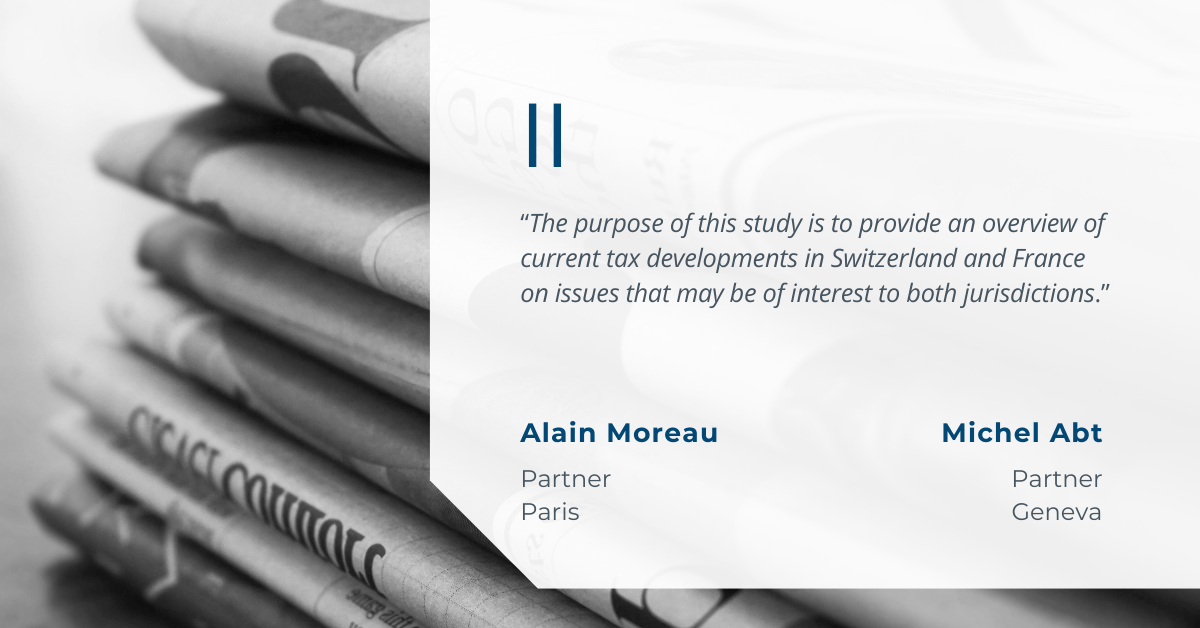 La présente étude a pour objet de dresser un panorama de l’actualité fiscale suisse et française, concernant des problématiques susceptibles d’intéresser les deux juridictions, aussi bien en matière conventionnelle, en matière de législation interne suisse, qu’en matière jurisprudentielle.