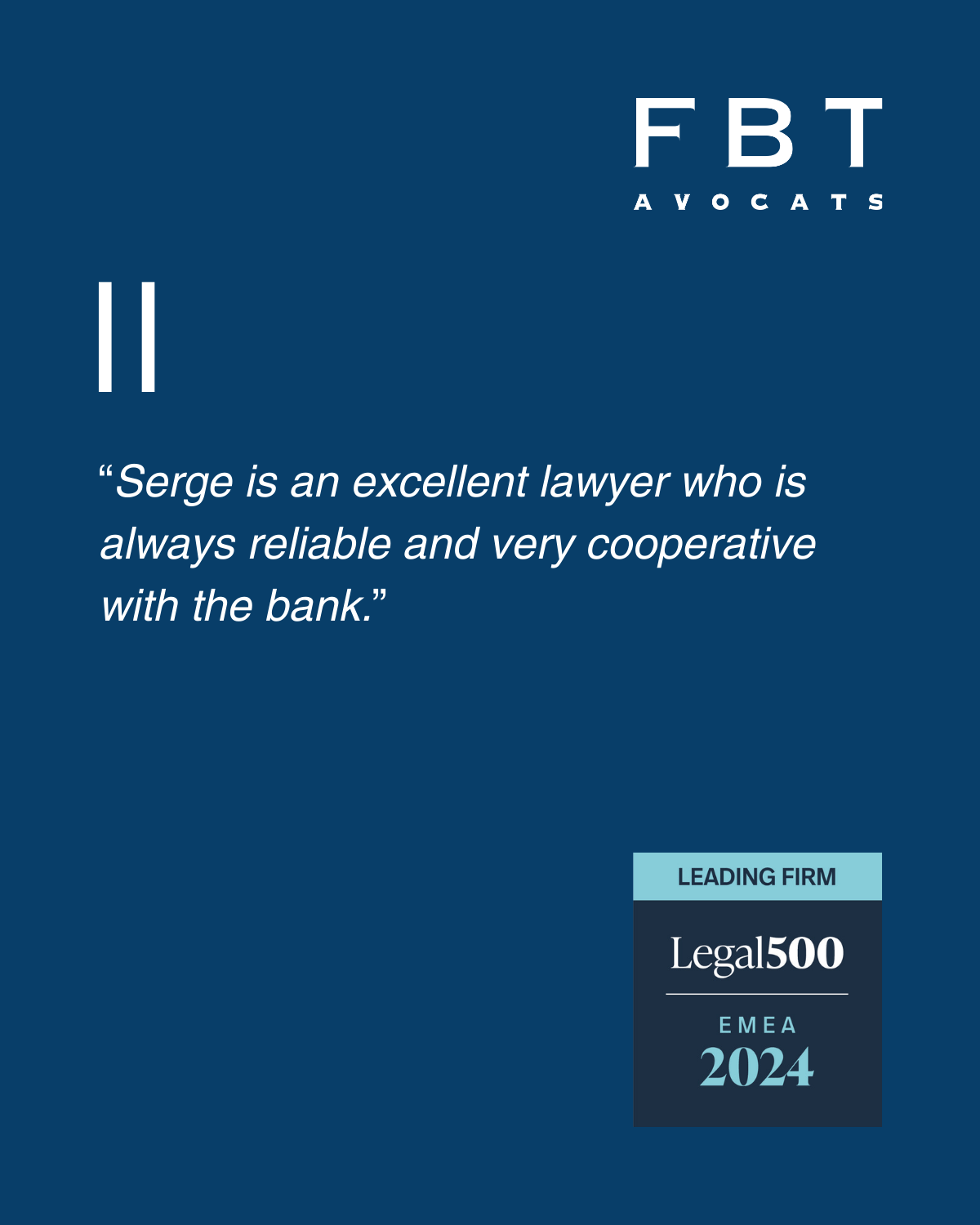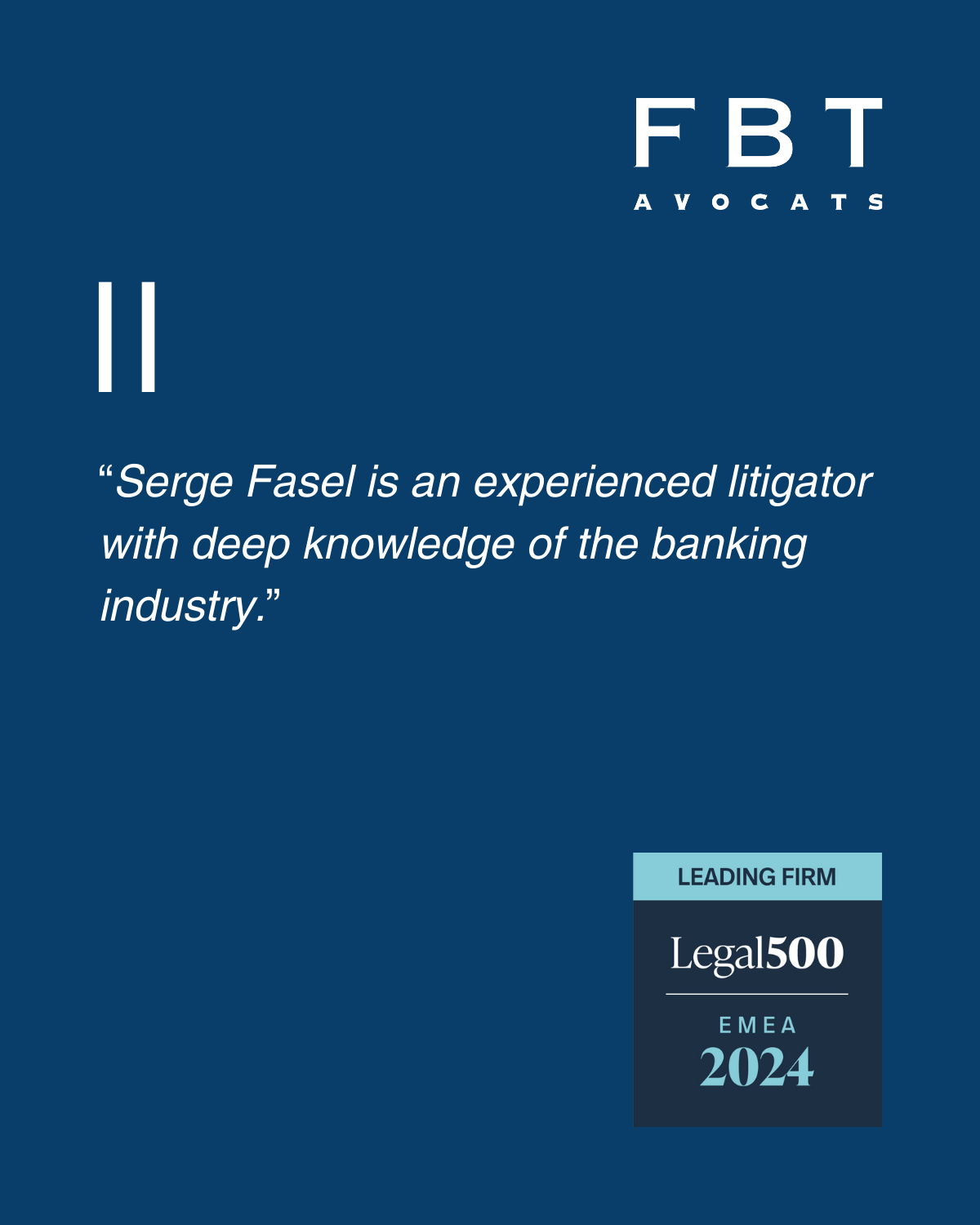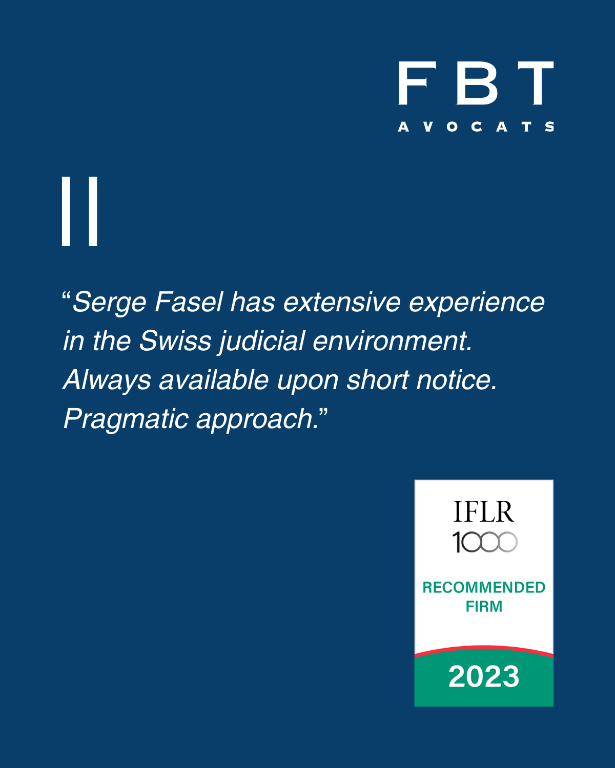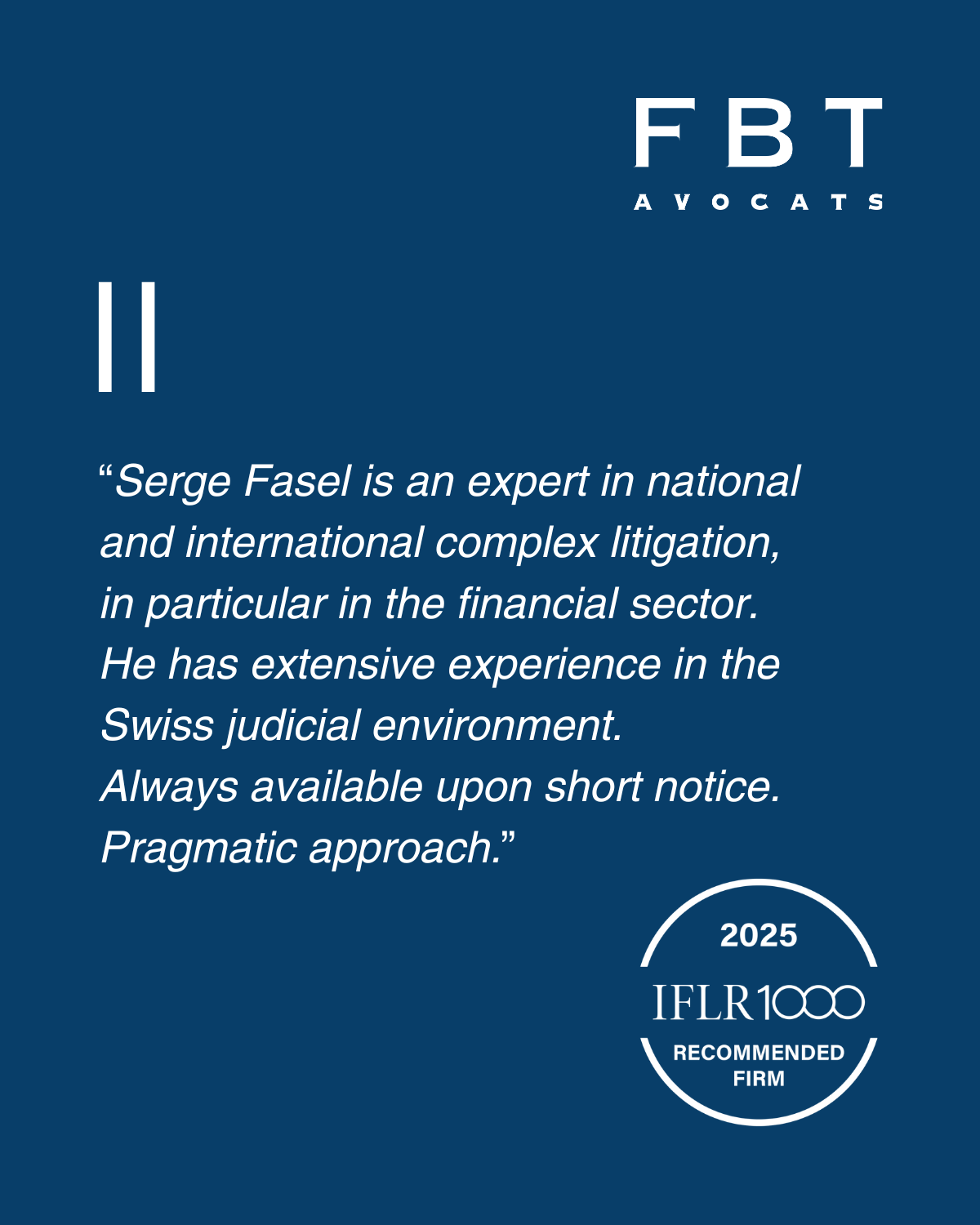 Serge Fasel est associé et responsable du groupe judiciaire de FBT. Il dispose d’une large expérience tant en matière de procédures menées devant des tribunaux ordinaires qu’en matière d’arbitrage, sur le plan national et international. Ses domaines d’activité comprennent toutes formes de litiges commerciaux, notamment bancaires et financiers.
